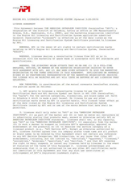 API EOLCS Legal Agreement TriTech Lubricants & Sales Pty Ltd Renewal Agreement 2020 to 2021